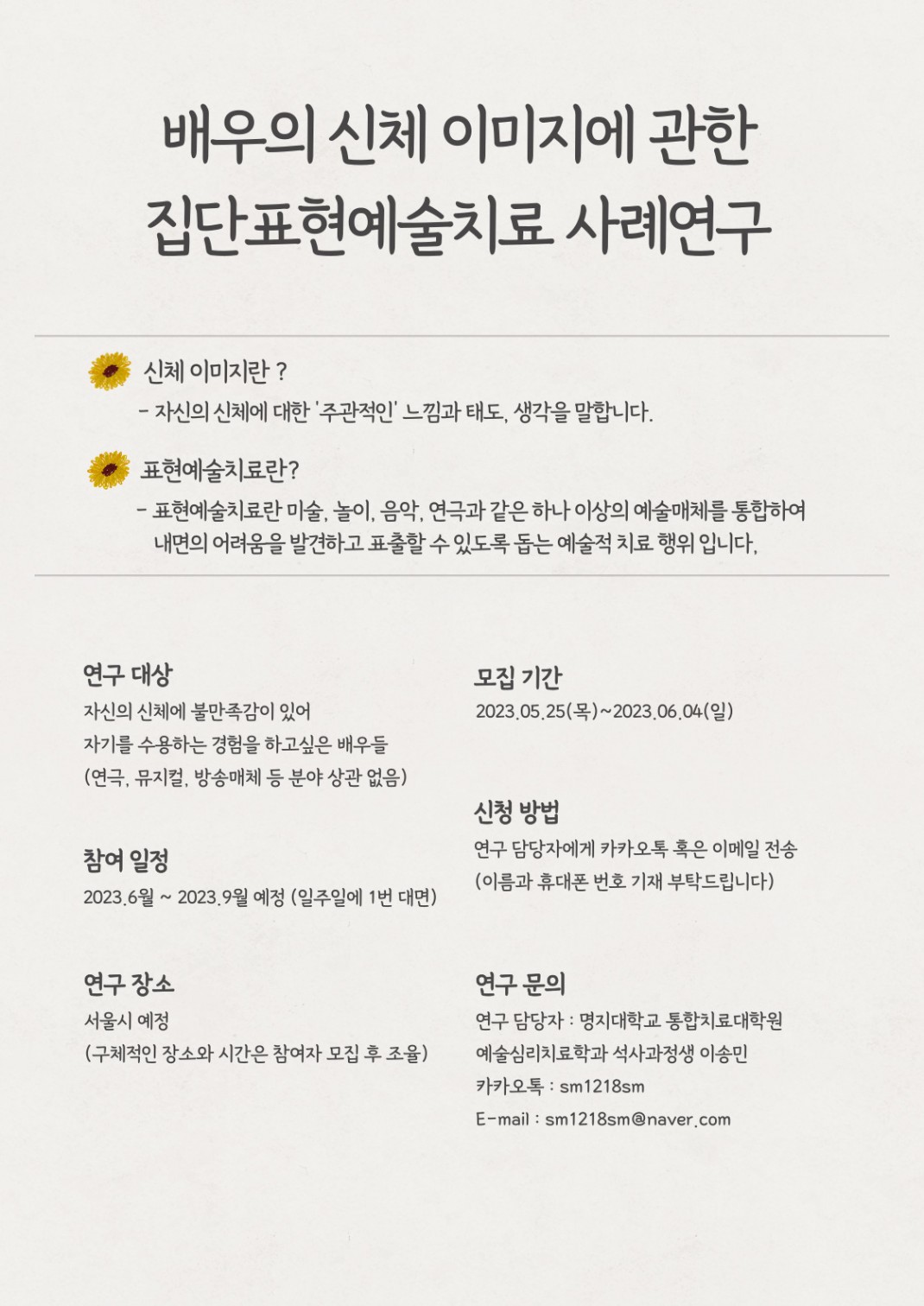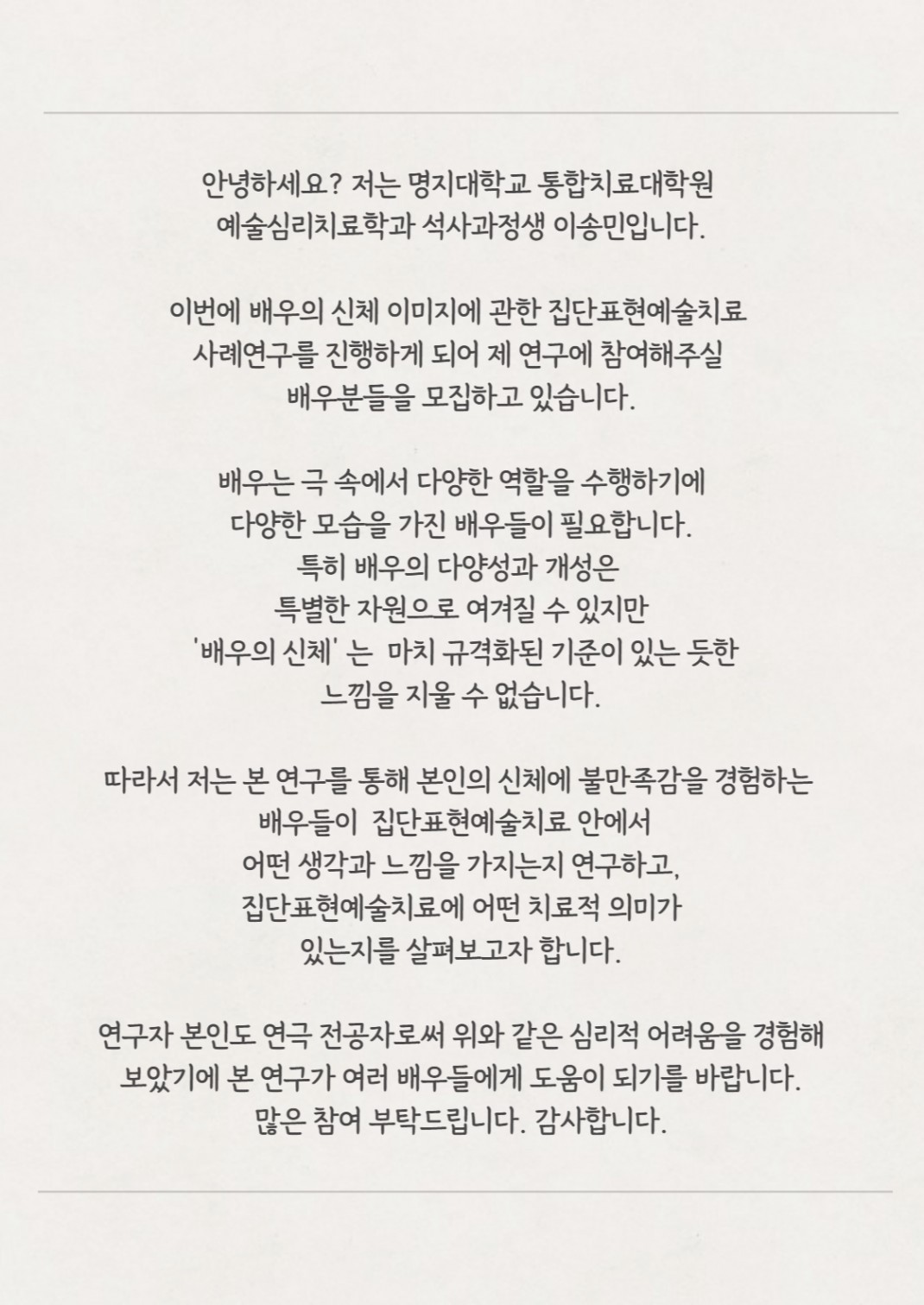 [프로그램 안내] 집단표현예술치료 사례연구 관련 연구대상자 배우 모집 안내
